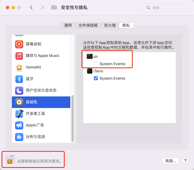 打开「系统偏好设置」-「安全性与隐私」,找到刚才提示的对应权限和应用,把左下角的锁打开后,勾选上;